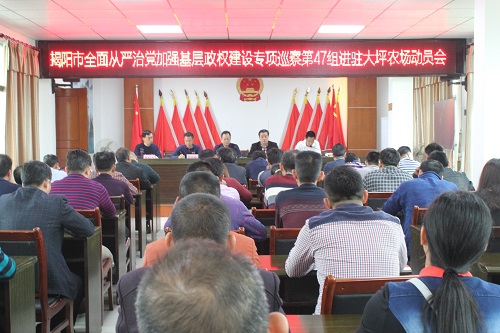 為深入貫徹落實(shí)揭陽(yáng)市委六屆六次全會(huì)精神,揭陽(yáng)市全面從嚴(yán)治黨加強(qiáng)基層政權(quán)建設(shè)專項(xiàng)巡察組將進(jìn)駐普寧各鄉(xiāng)鎮(zhèn)場(chǎng)街道,對(duì)普寧市28個(gè)鄉(xiāng)鎮(zhèn)場(chǎng)街道568個(gè)村(社區(qū))黨組織(延伸到村民小組)開展為期三個(gè)月的全面從嚴(yán)治黨加強(qiáng)基層政權(quán)建設(shè)專項(xiàng)巡察。2019年3月19日,揭陽(yáng)市全面從嚴(yán)治黨加強(qiáng)基層政權(quán)建設(shè)專項(xiàng)巡察第47組組長(zhǎng)吳振旭帶領(lǐng)其他成員共3人進(jìn)駐大坪農(nóng)場(chǎng)。3月20日上午,大坪農(nóng)場(chǎng)召開市全面從嚴(yán)治黨加強(qiáng)基層政權(quán)建設(shè)專項(xiàng)巡察工作動(dòng)員會(huì)議,會(huì)議由場(chǎng)黨委書記官錦周同志主持,參加會(huì)議的人員有揭陽(yáng)市委專項(xiàng)巡察組全體同志,普寧市掛鉤大坪農(nóng)場(chǎng)領(lǐng)導(dǎo),場(chǎng)機(jī)關(guān)全體干部職工、村(社區(qū))“兩委”成員、鄉(xiāng)賢咨詢委員會(huì)代表及村民代表等40多人。